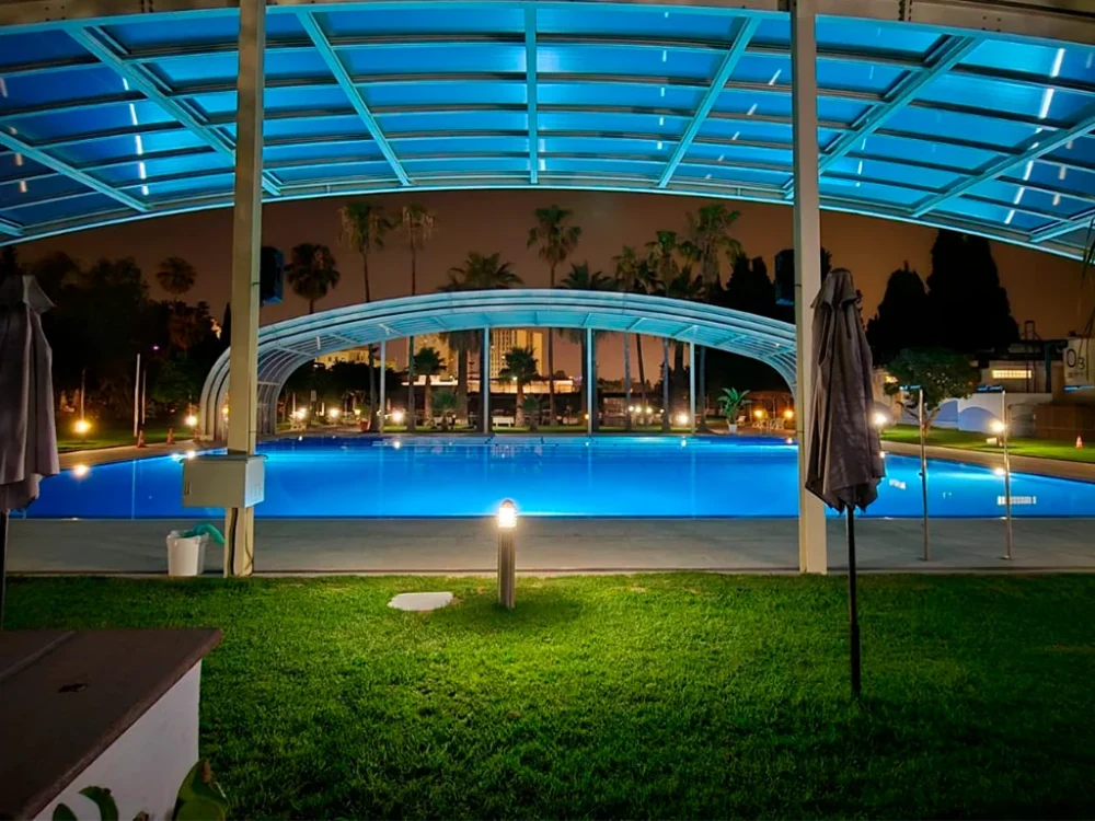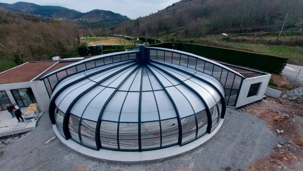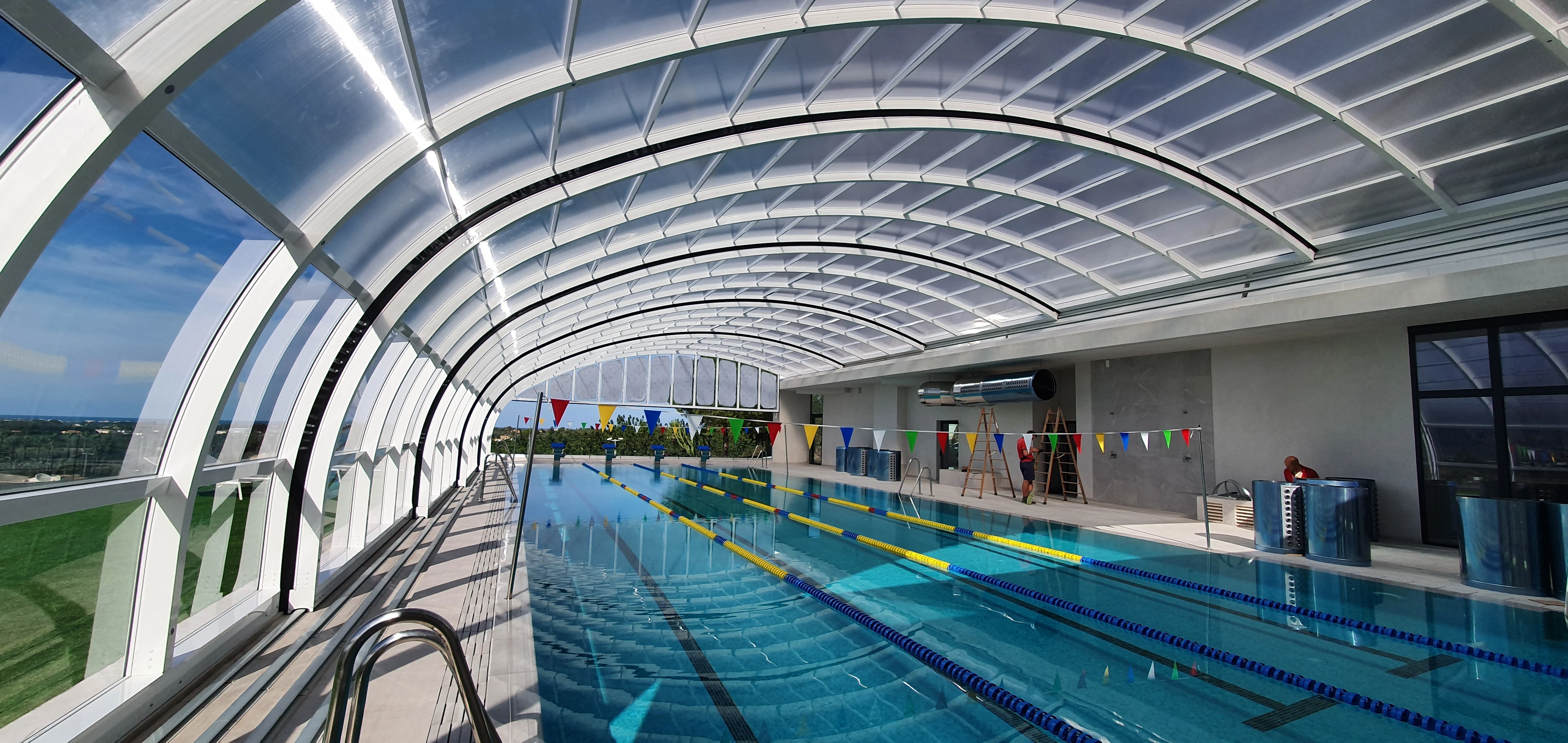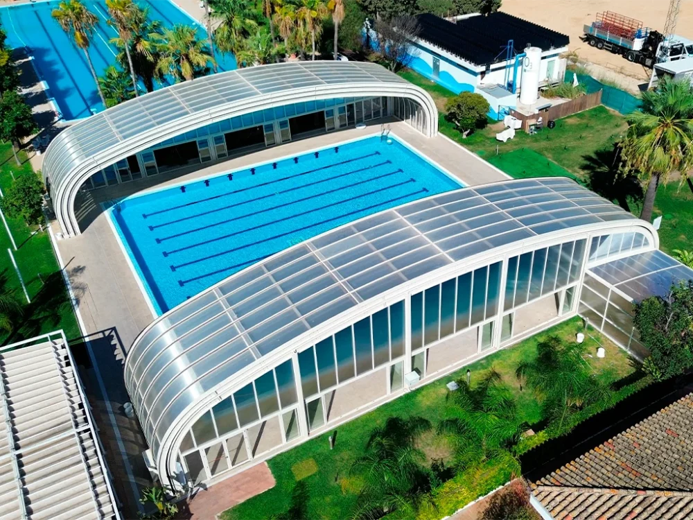 Elegiremos entones cúpulas para piscinas altas, podemos optar por una cubierta bien telescópica o bien de estructura fija con paneles elevables o con puerta corredera curvada.