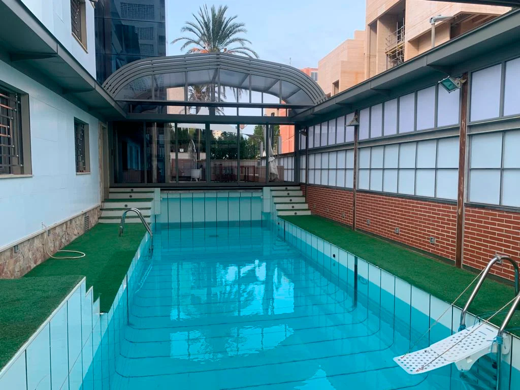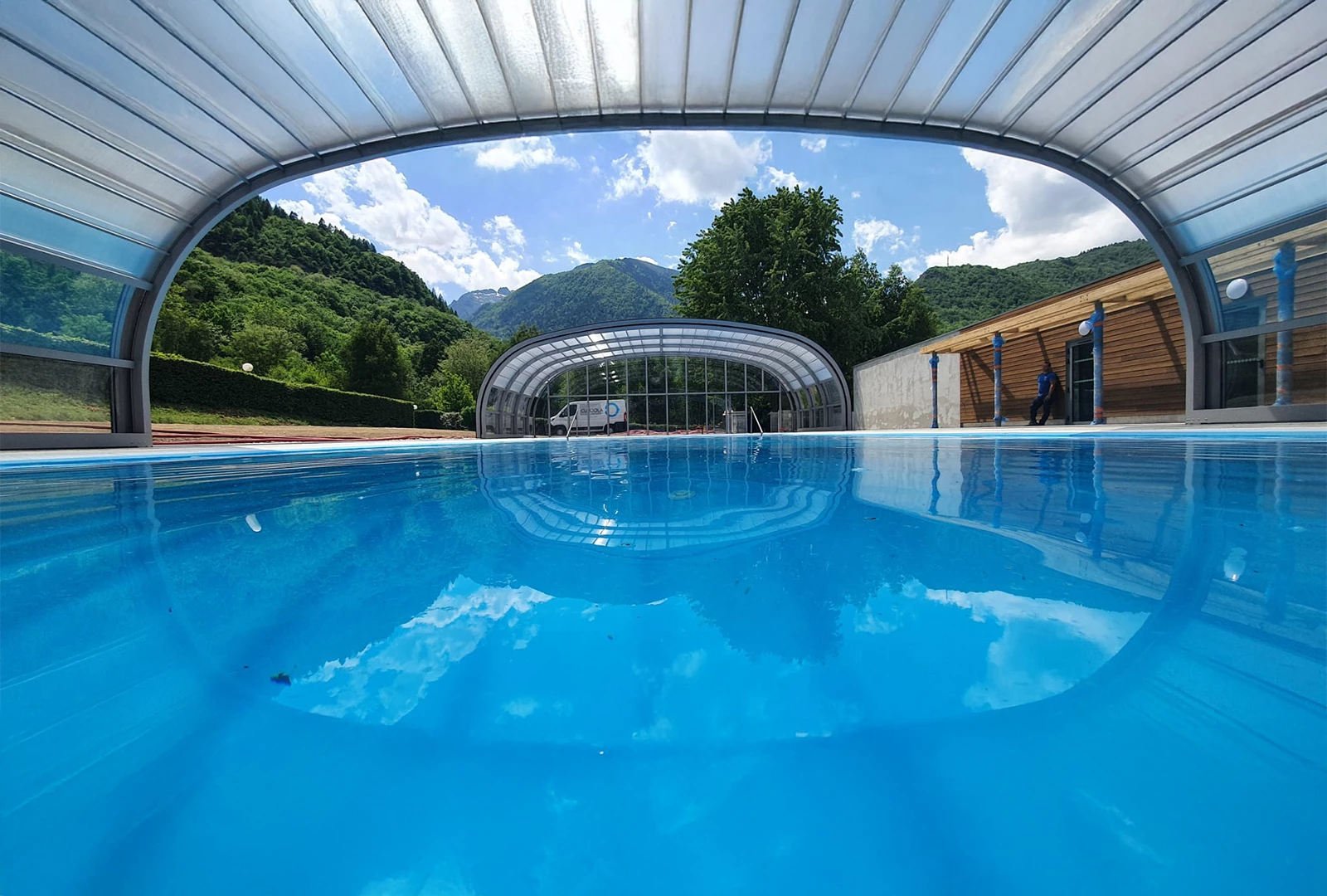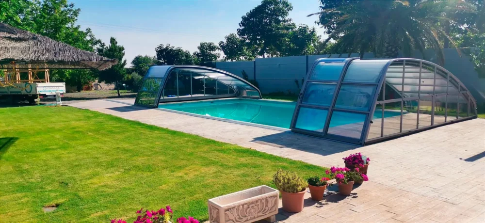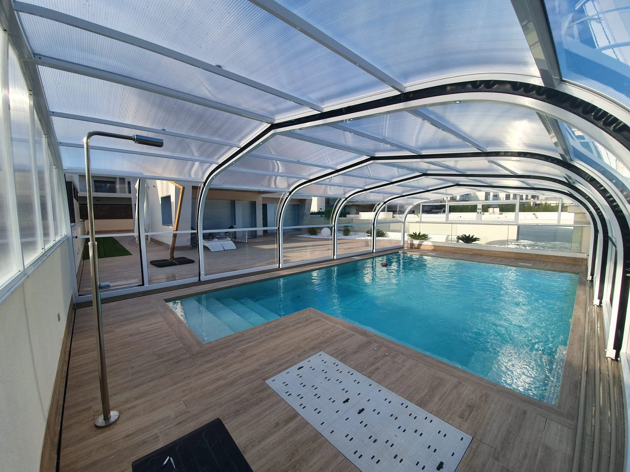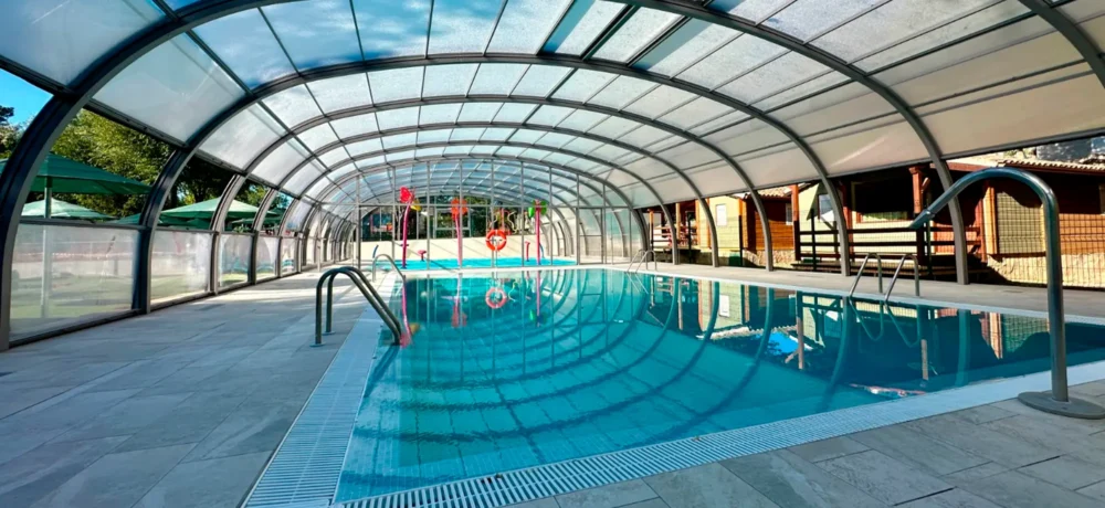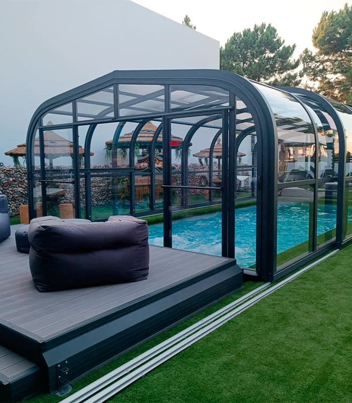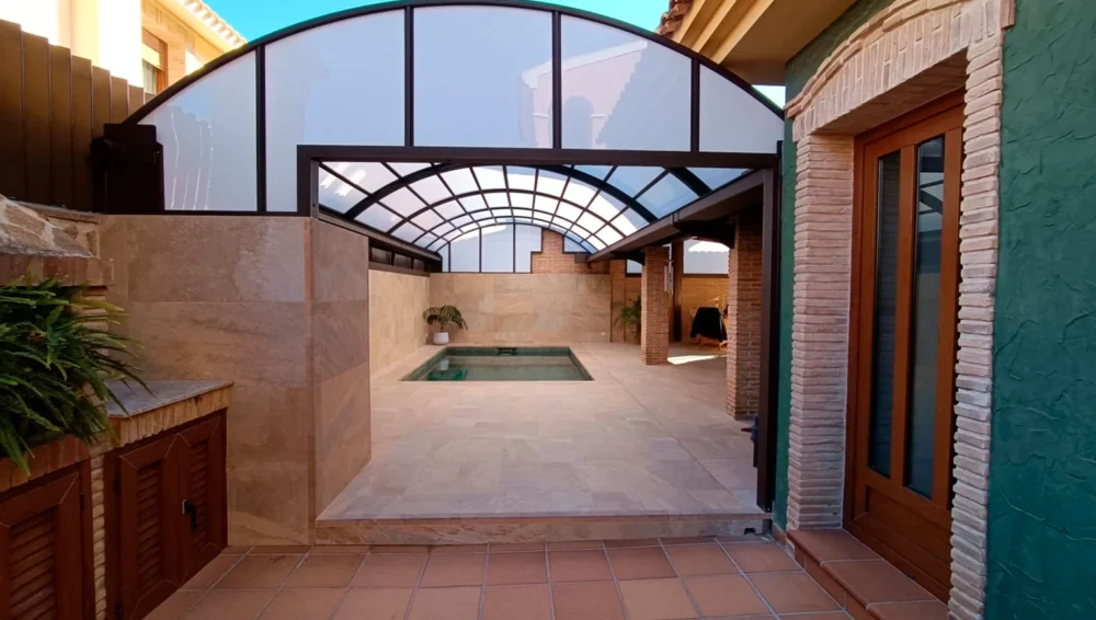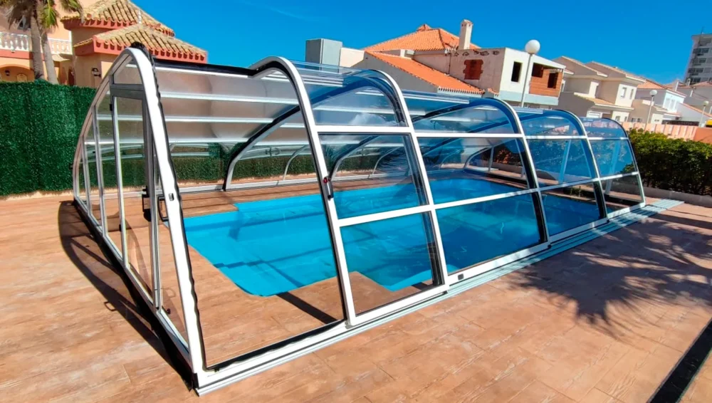 En este caso elegiremos una cúpula de piscina baja o semialta, telescópica para un fácil acceso al interior. Nos aseguraremos de tener puerta de acceso en el módulo mayor para poder acceder al interior sin necesidad de abrir la cubierta.