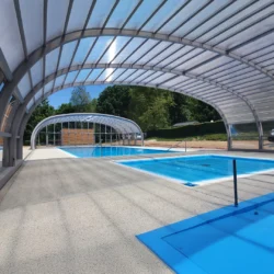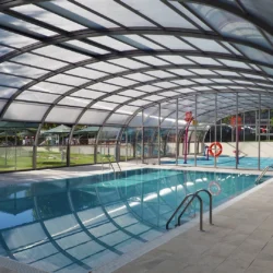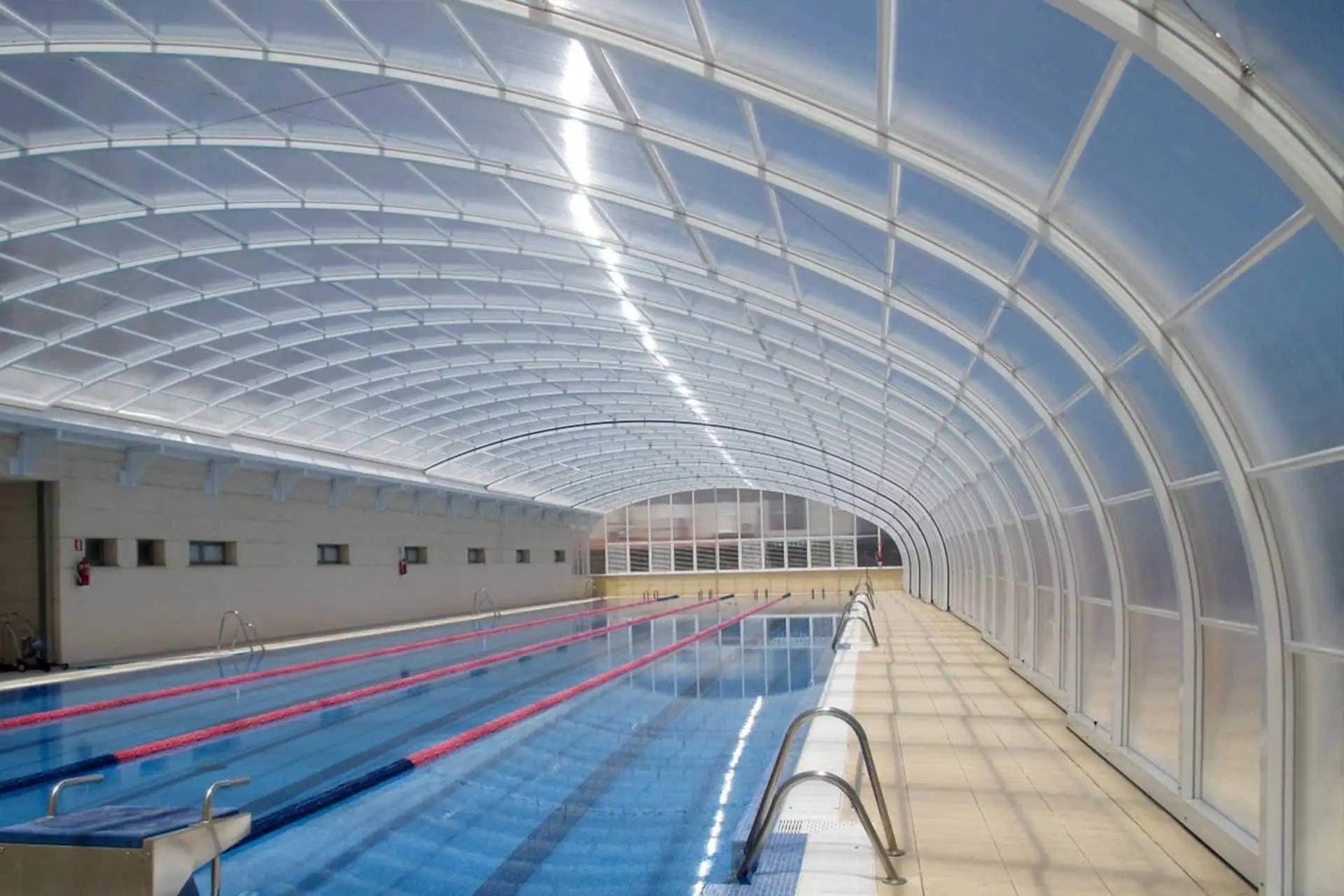 La coberta mòbil de piscina Vega Master Telescòpica, dissenyada amb grans arcs d’alumini i tancada amb policarbonat, és ideal per a piscines col·lectives.