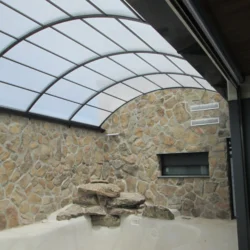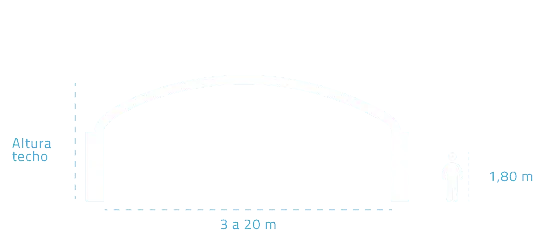 Por otra parte el techo se divide en módulos, que se desplazan sobre los raíles albergados en las canales. Estos módulos se componen de arcos de aluminio estructural con forma abovedada, y que se estudian en cada proyecto para adaptarlo al entorno y a las necesidades de la obra.