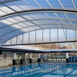 Els sostres telescòpics per a piscines són estructures d’alumini que aprofiten els suports existents de l’habitatge permetent crear un ambient càlid en el seu interior. D’aquesta manera allargarem la temporada de bany a més de gaudir dels avantatges d’una piscina exterior un cop obert el sostre.
