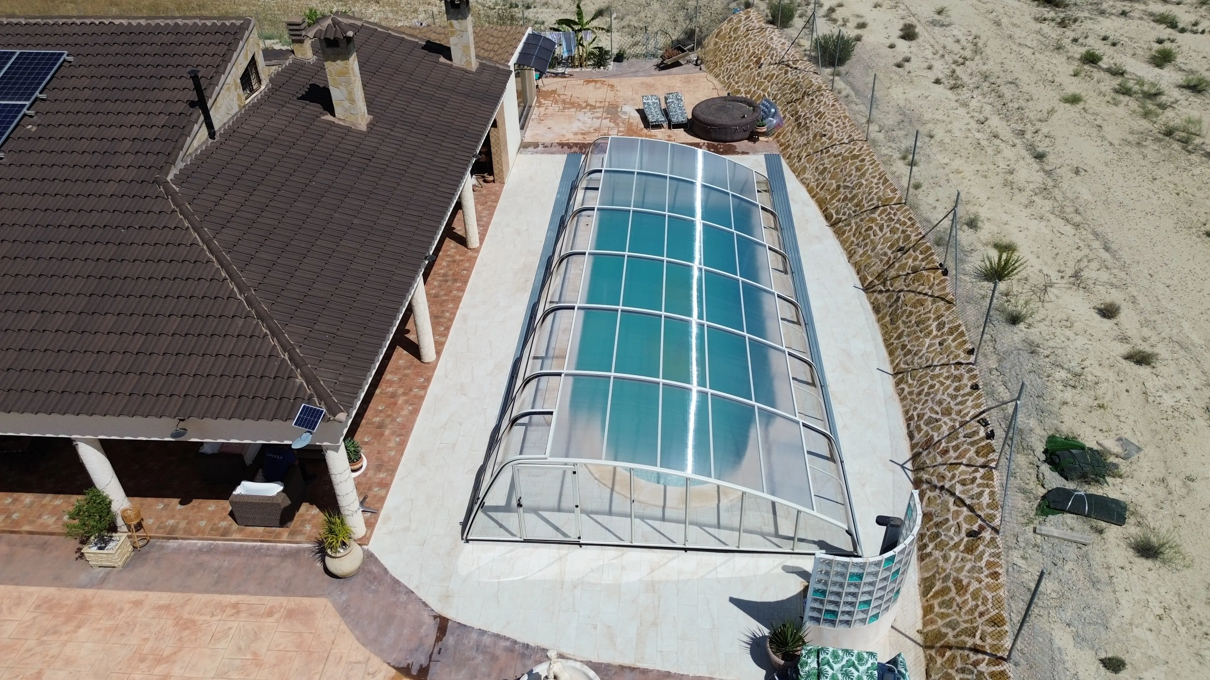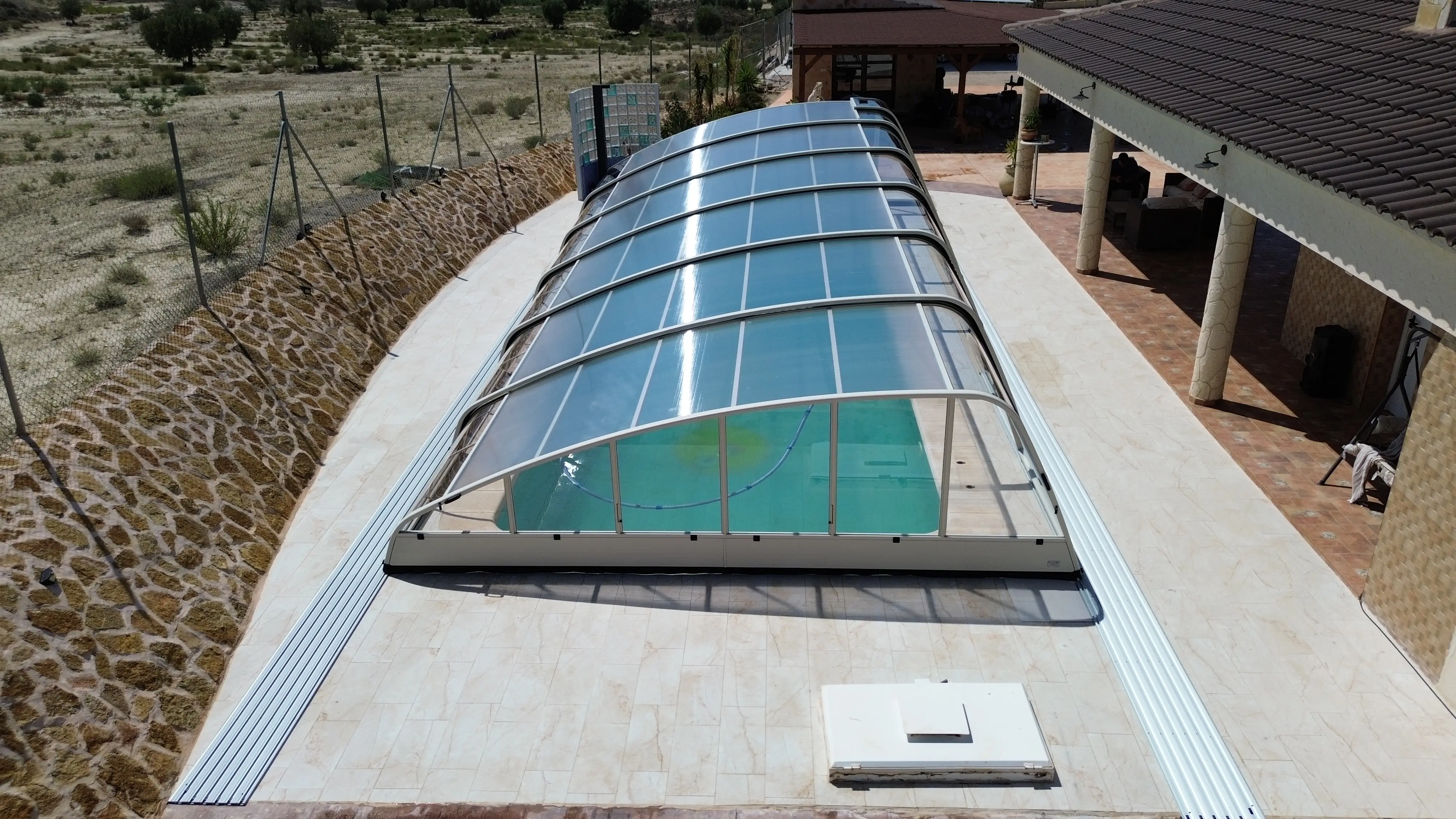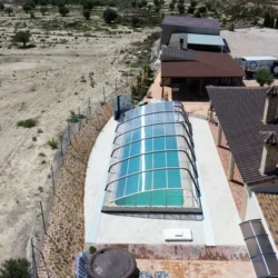 Velsa Elegant es una cubierta para piscina semialta asimétrica, con estructura de aluminio y cerrada con policarbonato en techo, laterales y frontales. Los módulos se desplazan sobre raíles de forma independiente pudiendo abrir un módulo central sin necesidad de abrir el extremo en primer lugar, lo que permite una mayor comodidad y confort.