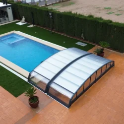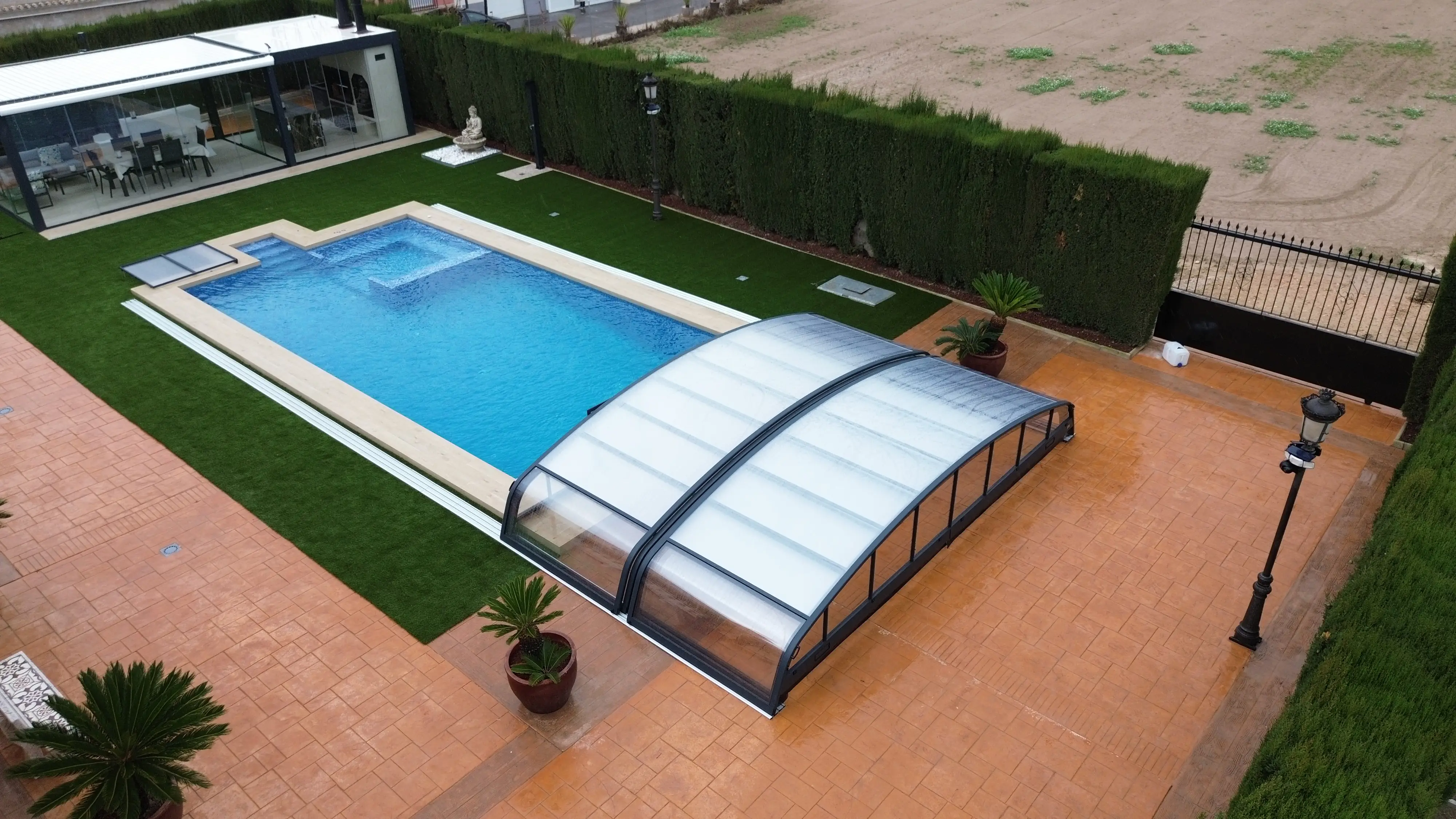 Cubierta baja para piscina, con estructura de aluminio y cerrada con policarbonato en techo, laterales y frontales. Este material te posibilita alargar la temporada de baño, protege de posibles accidentes y permite ahorrar en productos de mantenimiento de la piscina.